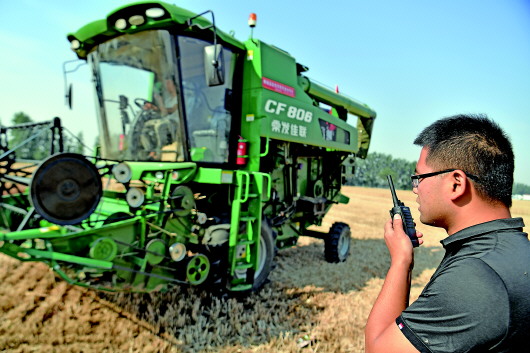 “以前的农机比较落后,一天最多收割三五十亩地,而且作业条件非常艰苦。”王连杰回忆到。今年,王连杰的农机合作社引进了两台先进的智能化收割机。“视频监控、GPS、自动空调什么都有,而且是集成化操作,就和咱们开自动挡汽车一样方便。”