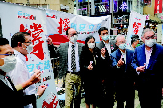 五月二十九日,在香港皇后大道中和毕打街交界处的“撑国安立法”街站,参与签名人士合影。 新华社记者王申摄