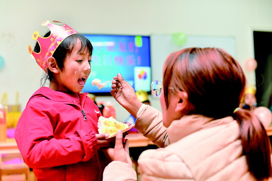 经过40多分钟的努力,破损的蛋糕终于修好了。晚上8点,孩子们走进活动室,看到大蛋糕,兴奋地叫了起来。戴上生日帽,唱起生日歌,孩子们开心地吃着蛋糕。