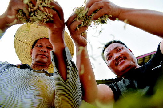 汤桥村村民林英华(右)和邻居在屋前晾晒金银花(5月20日摄)。 |