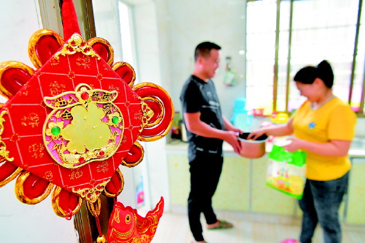 在修水县上奉镇移民搬迁安置点,麻洞村村民胡尚海和妻子在安置房内准备午饭(5月21日摄)。 |