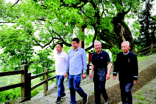 5月21日,金坵村的四位村书记兰文忠(现任)、潘欣根、陈立平、雷正余(从左至右)走在村里的小路上。