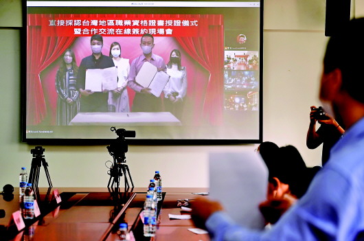 ▲5月23日,“直接采认台湾地区职业资格证书授证仪式暨合作交流在线签约现场会”在福建福州举行。据介绍,该活动旨在为来福州创业就业的台湾青年创造有利条件。