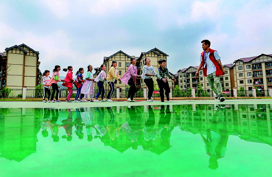 5月31日,在贵州省毕节市七星关区柏杨林街道易地扶贫搬迁安置区,孩子们和志愿者玩“老鹰捉小鸡”游戏。 新华社发(王纯亮摄)