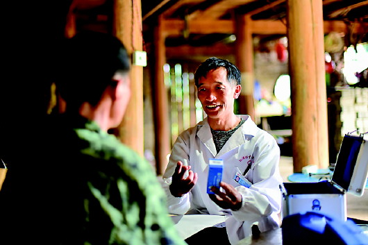 5月27日,村医龙光庆(右)向双尧村村民杨胜良介绍药品服用的注意事项。 |