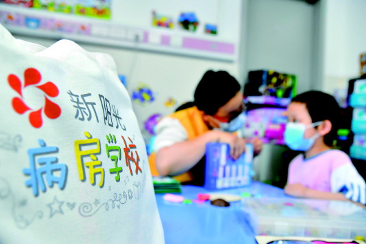 这所“魔法学校”就是2015年济南市儿童医院引入的慈善公益项目——新阳光病房学校,由全职老师郭金路和大学生志愿者组成,主要通过陪伴式教学,为孩子们开设手工制作、绘本导读、语言训练、科学知识等课程。新阳光病房学校就像一缕阳光照进病房,抚慰备受病魔折磨的患儿,为孩子们带来温暖和快乐,被患儿和家长称为“魔法学校”。 新华社记者郭绪雷摄