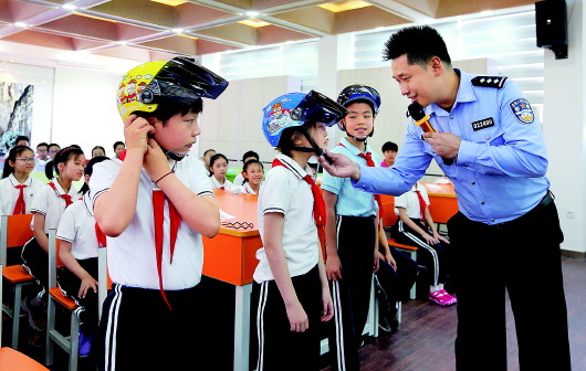 6月2日,上海市公安局徐汇分局交警支队民警韩永鑫在徐汇区逸夫小学指导小学生正确佩戴头盔。