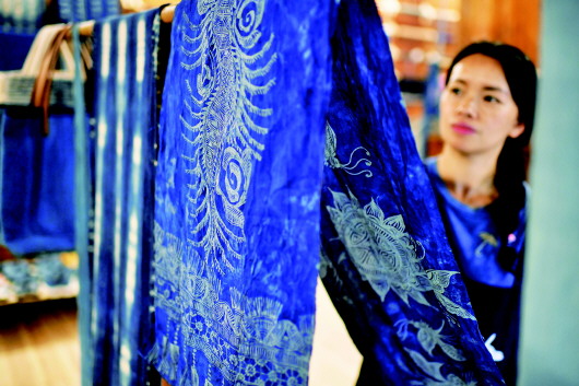 5月28日,杨成兰在整理制作好的侗族土布围巾。
