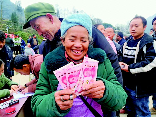 ▲1月23日,农民在毕节市纳雍县董地乡扶贫产业分红大会上领到分红。新华社资料片 |