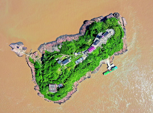 登上七里屿岛山顶,一根十余米高的国旗杆遥遥在目,一抹鲜艳的红色在海天交接的碧蓝晴空下分外耀眼。
