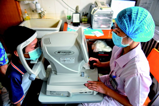 6月6日,在中南大学湘雅三医院,医务人员(右)在为小朋友做眼科检查。