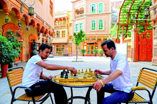 图4:5月26日,两名商户在新疆和田市“团城”的鸽子巷下棋。 均为新华社记者沙达提摄