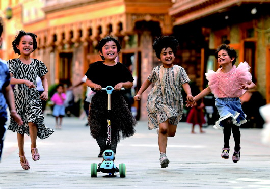 图1:5月27日,孩子们在新疆和田市“团城”的鸽子巷玩耍。