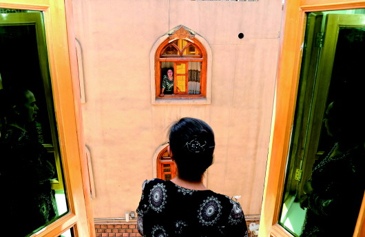 图2:5月27日,在新疆和田市“团城”的鸽子巷,米热古丽·阿布拉与邻居阿米娜·麦提如则聊天。