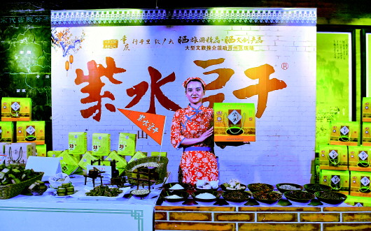 ▲6月11日,工作人员在“双晒”活动中展示推介开州特产——紫水豆干。 新华社发(刘康摄) |