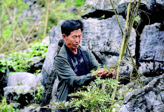 程敦儒说:“石漠化山区缺水,苦参刚好耐旱,并且不怕病虫害。我就在平地里育苗,然后再移栽;只用农家肥做肥料,不用化肥;每棵苦参旁边都插上竹竿,苦参枝条就顺着石头和竹竿长,这里的苦参比种在其他地方的明显长得更好,成本更低,收益更高。”