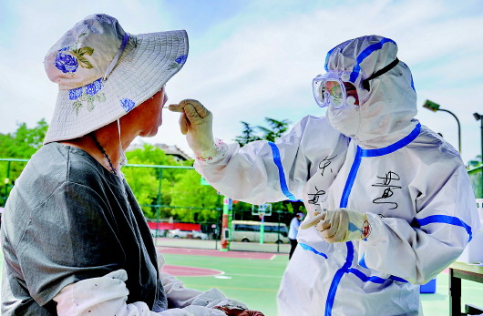 ▲6月15日,北京市丰台区东高地街道采样点工作人员为市民做咽拭子采样。 新华社记者李欣摄 |