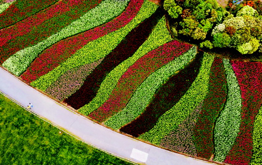 4月14日拍摄的上海世纪公园“七彩花田”(无人机照片)。 本报记者刘颖摄 |
