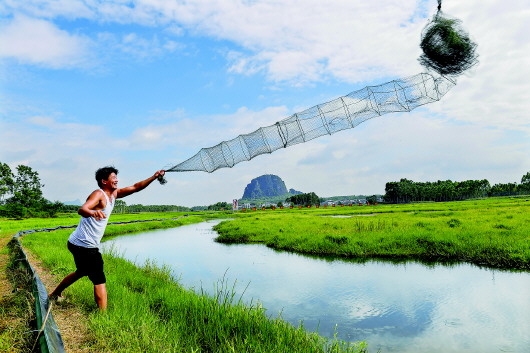 ▲6月17日,在广西武宣县禄新镇上堂村稻虾轮作养殖示范基地,村民将捕虾笼抛入虾塘中。近年来,广西武宣县禄新镇上堂村为拓宽当地群众增收渠道,结合本地实际利用稻田空间进行稻虾轮作互养,发展“稻虾轮作”的立体种养模式,助力当地群众脱贫增收。 新华社记者曹祎铭摄