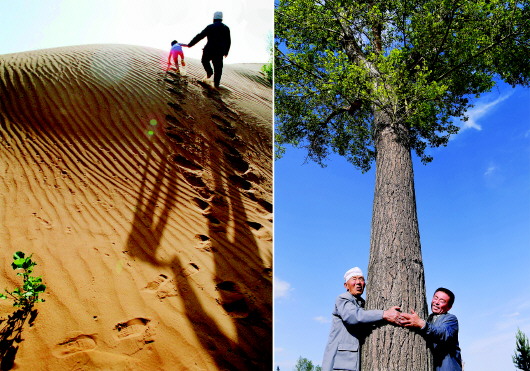 拼版照片左图:1998年8月,榆林市靖边县郭成旺老人带着曾孙行进在沙漠中。老人的希望是:子子孙孙植树造林,直到沙漠都变成绿洲;右图:2020年5月22日,99岁的郭成旺老人(左)与孙儿郭建军抱着当年栽下的第一棵杨树,向参观者介绍当年植树的情景。本报记者陶明摄