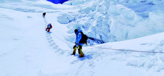 ▲5月9日,陈刚等人从6500米营地前往7028米营地,攀登大冰壁途中。