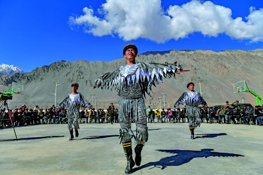 ▲新疆塔什库尔干塔吉克自治县文工团演员在热斯喀木村表演塔吉克族鹰舞。