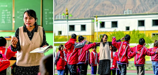 ▲拼版照片:左图为来自三亚的周冰倩在新疆塔县城乡寄宿制小学讲课;右图为周冰倩和学生们在课间一起跳舞。 新华社记者胡虎虎摄 |
