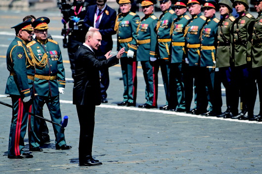 6月24日,俄罗斯总统普京(前右)在莫斯科红场举行的阅兵式结束后对受阅部队代表讲话。当日,俄罗斯在首都莫斯科隆重举行纪念卫国战争胜利75周年阅兵式。 新华社记者白雪骐摄