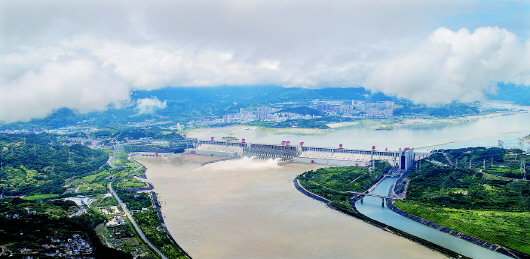 为迎接近期可能到来的洪水,三峡枢纽于6月29日上午开启两个泄洪孔,加大下泄流量。这是三峡枢纽今年首次泄洪。新华社记者肖艺九摄