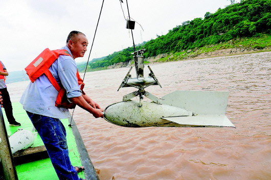 ▲7月2日,在水文作业船上,长江清溪场水文站工作人员将水样采集铅鱼放入水中。