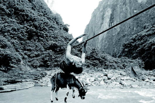 且沙次干背羊过溜索(2005年6月5日摄)。 新华社发(林强摄)