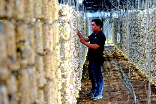 在安徽岳西县来榜镇关河村,吴松青在大棚内查看木耳长势(6月24日摄)。