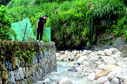 在安徽岳西县来榜镇公山村,汪链在检查村里新修建的河坝(6月24日摄)。