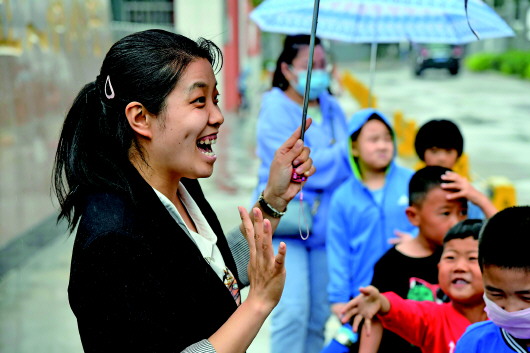 6月23日,在三涧溪村幼儿园,放学后老师送孩子们回家。 |