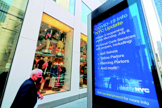 7月4日,一名行人从美国纽约第五大道显示新冠疫情最新情况的信息屏旁经过。 均由新华社记者王迎摄