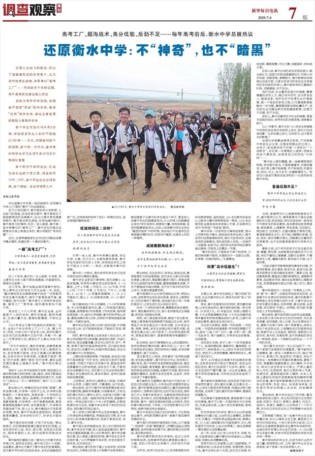 近三年来,衡中站稳全国百强高中前列,考上清华北大的学生几乎占全省一半。因此,“重点高校招生名额都被衡中抢走”“优秀教师和学生集中到衡中,破坏了教育资源平衡,衡中崛起,县中沦陷”“衡中是令人恐怖的考试机器、高考工厂”等声音,每年高考前后不绝于耳。