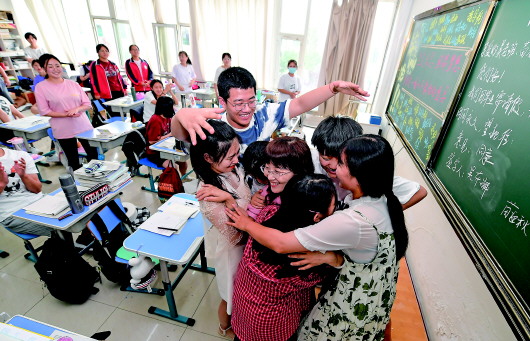 ▲7月6日,吉林省孤儿学校高三年级学生与班主任吴东辉相拥庆祝毕业。