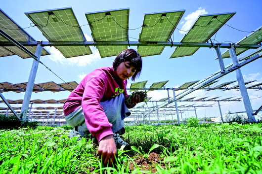 ▲徐亚茹在德胜村“农光互补”项目区光伏发电板下查看种植的药材长势。 新华社记者牟宇摄 |