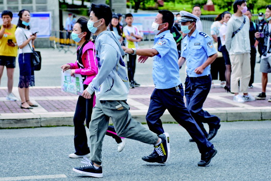 7月7日,在贵州省六盘水市第三中学考点外,两名考生走错考场,警察紧急安排车辆送他们前往正确的考场。当日,2020年高考拉开帷幕。新华社记者刘续摄