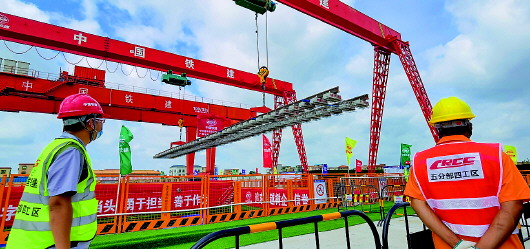 7月10日,在广州地铁18号线横沥至番禺广场区间4号中间风井的铺轨基地内,作业人员铺设完成首节轨排。 新华社发(王荃荃摄)