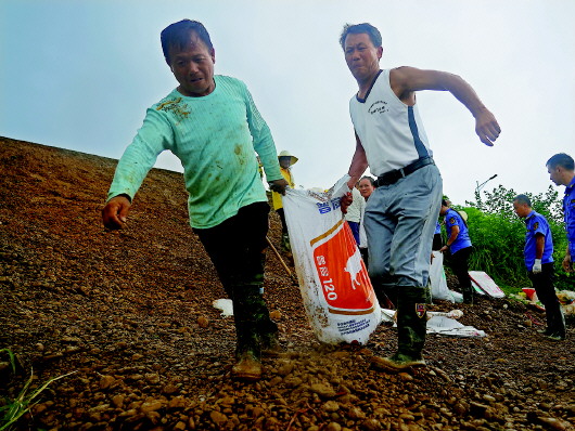 7月9日,邵忠如(前右)和村民们运送沙袋,封堵圩堤上的泡泉。