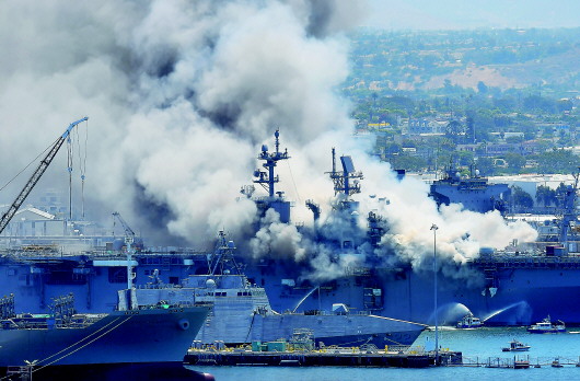 ◤7月12日,美国加利福尼亚州圣迭戈海军基地起火冒出浓烟。停泊在加利福尼亚州圣迭戈海军基地的一艘美军两栖攻击舰12日发生火灾,造成包括17名海军士兵在内的21人受伤。 新华社发