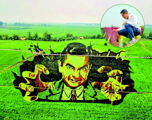 ▲大图:“稻梦空间”2020年稻田画作品《憨豆先生》。小图:张爱忠在稻田旁查看秧苗。受访者供图