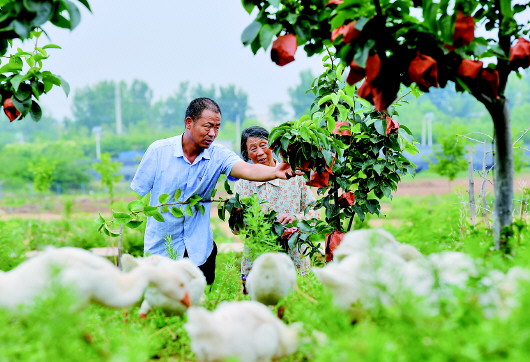 ▲6月11日,李健(左)在桐柏县埠江镇付楼村黄金梨种植基地查看黄金梨套袋情况。本报记者郝源摄