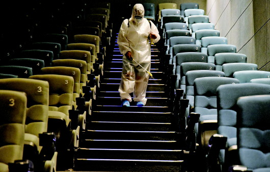 ▲7月19日,河北省邯郸市丛台区一家影院的工作人员对放映厅进行消毒,为恢复开放营业做准备。国家电影局7月16日下发通知规定,低风险地区在电影院各项防控措施有效落实到位的前提下,可于7月20日有序恢复开放营业。 新华社发(郝群英摄)