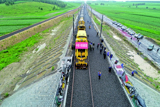 7月20日,随着牡佳(牡丹江至佳木斯)高铁佳木斯市桦南县施工现场开始进行铺轨作业,牡佳高铁全线进入铺轨施工阶段。 新华社发