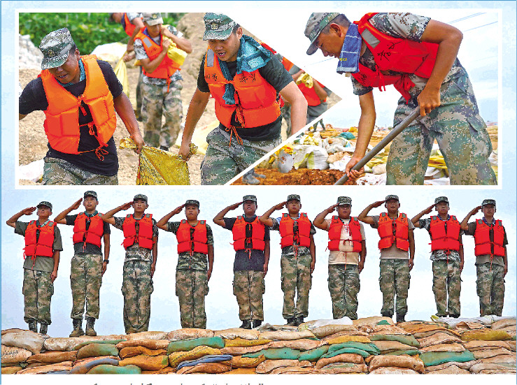 小图左:在江西鄱阳县昌江圩堤上,退伍老兵在搬运沙袋加固圩堤(7月18日摄)。