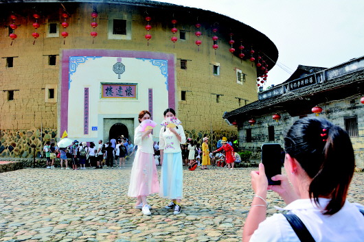 “一!二!三!茄子!”在古镇怀远楼前,来自内蒙古的蒋女士正在为自己的“姐妹团”成员拍照留念。“我们团24号到厦门,在厦门住了一晚后,第二天就来这里看土楼了,”谈起这次旅行经历,蒋女士显得有些兴奋,“一听说跨省组团游恢复了,我们几个姐妹都是第一时间订了票,要来一次说走就走的旅行!”