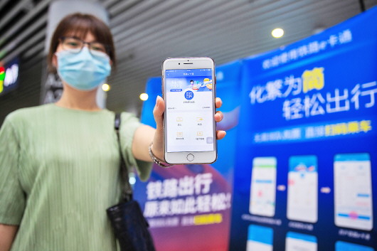 7月28日,在南京南站,一名旅客展示“铁路e卡通”应用。