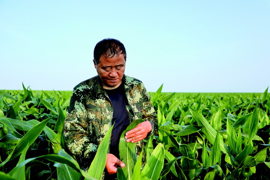 ▲陈华在黑龙江省绥棱县靠山村玉米地里查看玉米长势(7月10日摄)。 本报记者齐泓鑫摄